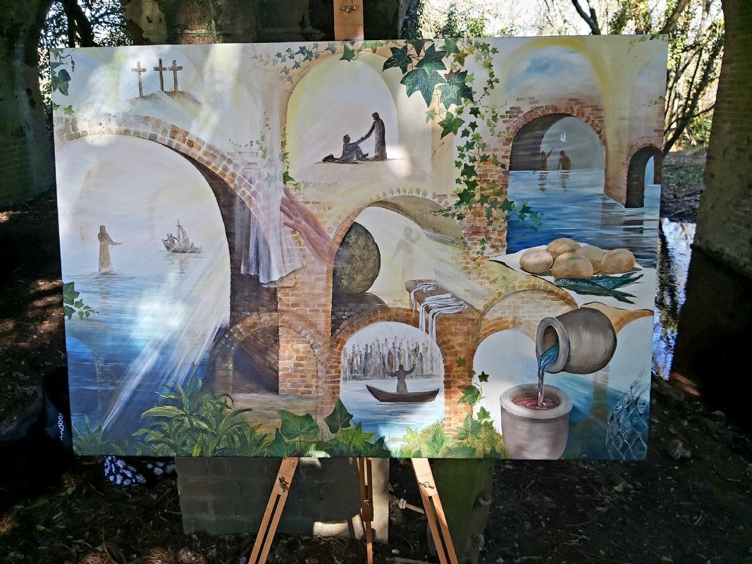 The place I am painting is a place that I used to play as a child. The arches took a road up over a canal and then a railway... both now gone. One of the arches was very low and had a curtain of ivy hanging over each end. When I used to crouch in there I imagined it was the tomb that held Jesus’ body. This was the first place I thought of when I was planning this picture!